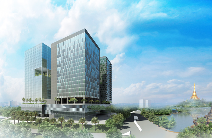 缅甸坎塔亚中心项目总用地3.53英亩,总建筑面积116662.03M2,由4栋20-25层的高层组成,总投资约1.6亿美金,分三期建设:一期为住宅楼,二期为写字楼,三期为酒店及酒店式公寓。