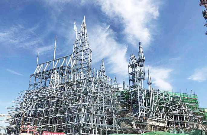 该工程技术难点多、施工难度大,共由15个单体组成,分为三大片区:510禁忌之旅片区、村落片区和鹰马片区。其中510禁忌之旅片区为哈利波特景区的核心。工程主体结构为钢结构,总构件数量23000余件,平均每根构件重量263kg,焊缝总长度7000余米, 高强螺栓16万套,其中99%为扭剪型高强螺栓。510禁忌之旅单体分3个子区域:BOX、温室和假山城堡,其中BOX区域为桁架结构,东西向111.25米,南北向93.6米, 共有桁架14榀,最大跨度31.5米,最大重量22.5吨;假山城堡区域为塔桅结构,最大高度47.5米。村落区域为全焊接钢结构,截面种类多,空间结构形状复杂,非常规节点数量多。其中506单体为双曲异形结构。