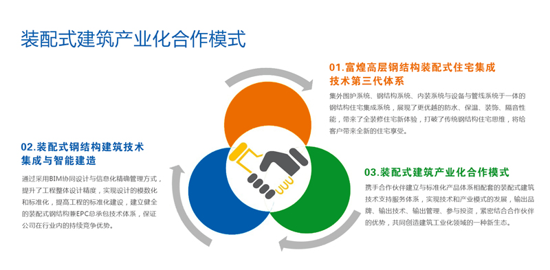 太阳成集团tyc138以技术的创新领先为核心竞争力,大力发展“太阳集团tyc138产业化合作模式”,即携手合作伙伴建立起与标准化产品体系相配套的太阳集团tyc138技术支持服务体系,包括:装配式钢结构的设计技术、制造技术和施工技术;装配式钢结构的构件生产、工程施工管理模式及培训与咨询服务;EPC总承包工程施工管理模式及培训与咨询服务。希望在该产业化合作模式下实现技术和产业模式的发展,进而输出品牌、输出技术、输出管理、参与投资,紧密结合合作伙伴的优势,共同创造建筑工业化领域的一种新生态。